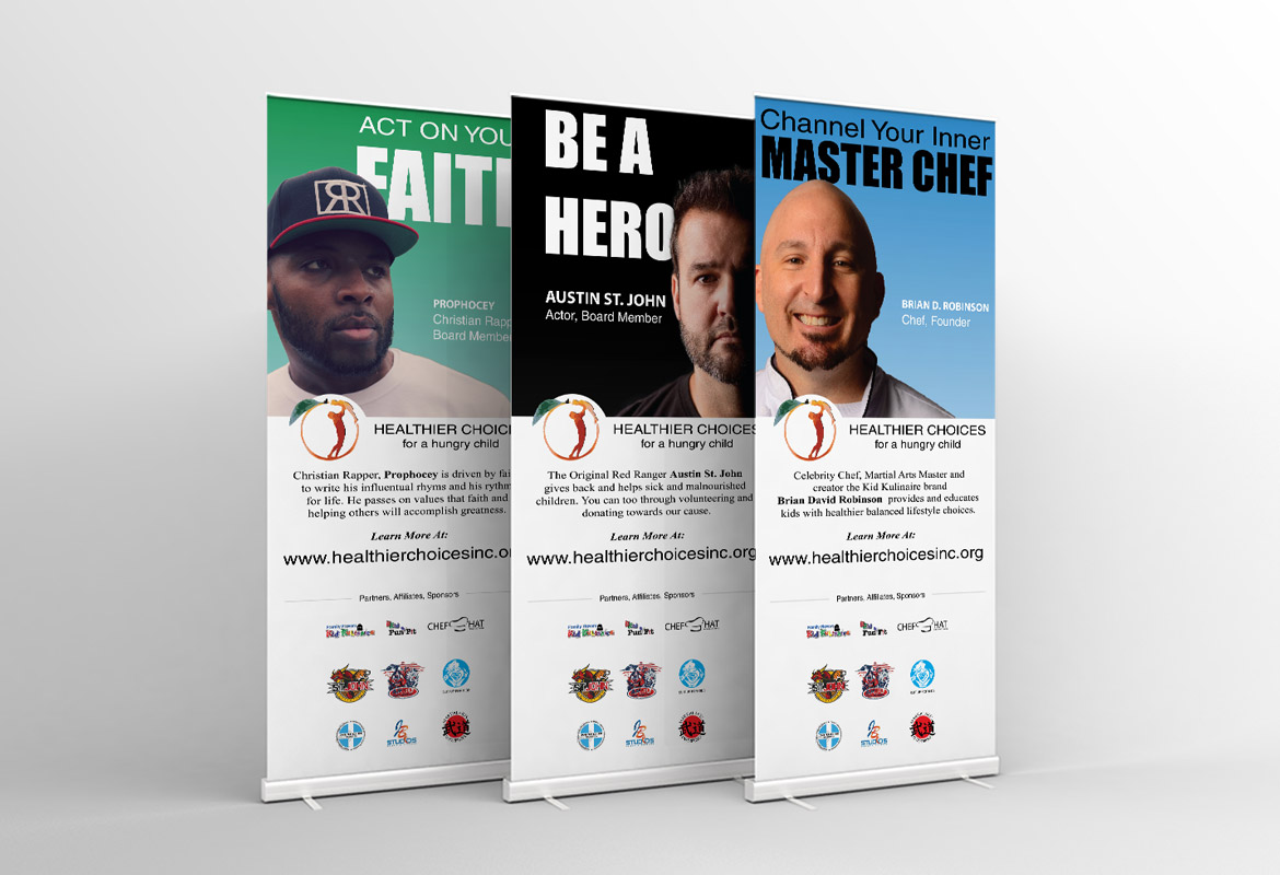 A roll up banner design featuring 3 celebrity board members of the non-profit healthier choices for a hungry child representing 3 call to actions used at the 2018 Arnold Fitness Expo - Children's Festival at the booths of Austin St. John, Celebrity Chef Brian and Christian Rapper Prophocey.